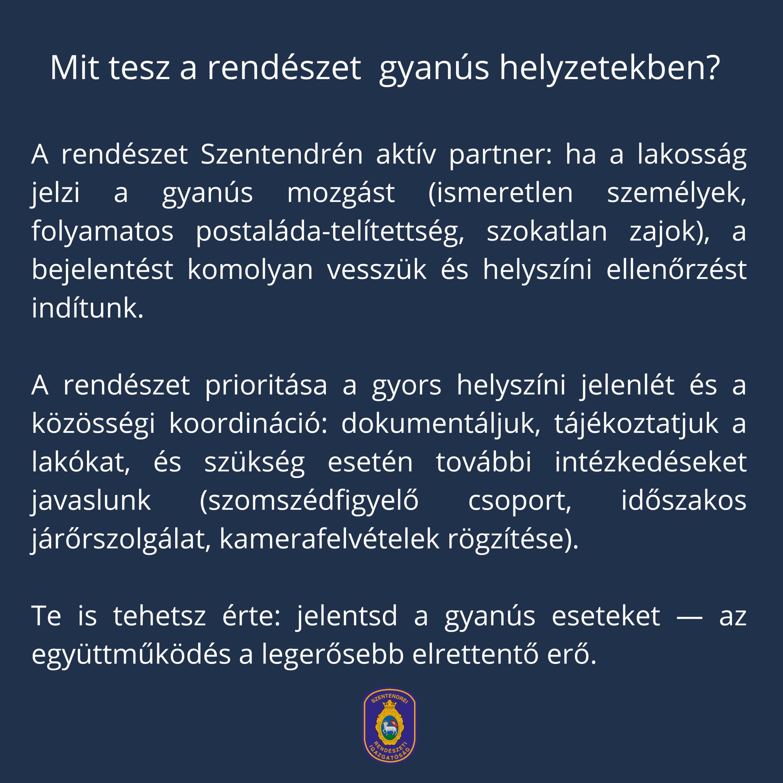Az őszi hónapokban a rövidülő nappalok és a sötétebb időszakok miatt megnő a lopások, betörések és közterületi szabálysértések kockázata. A Szentendrei Rendészet célja, hogy közösen erősítsük meg városunk biztonságát, és mindenki nyugodtan, biztonságban élhesse a mindennapjait.