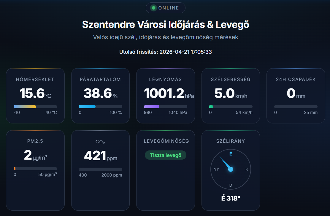 A felület mobilbarát, így akár útközben, a buszra várva vagy munkába indulás előtt is könnyen ellenőrizhető a szentendrei mikroklíma pillanatnyi állapota.